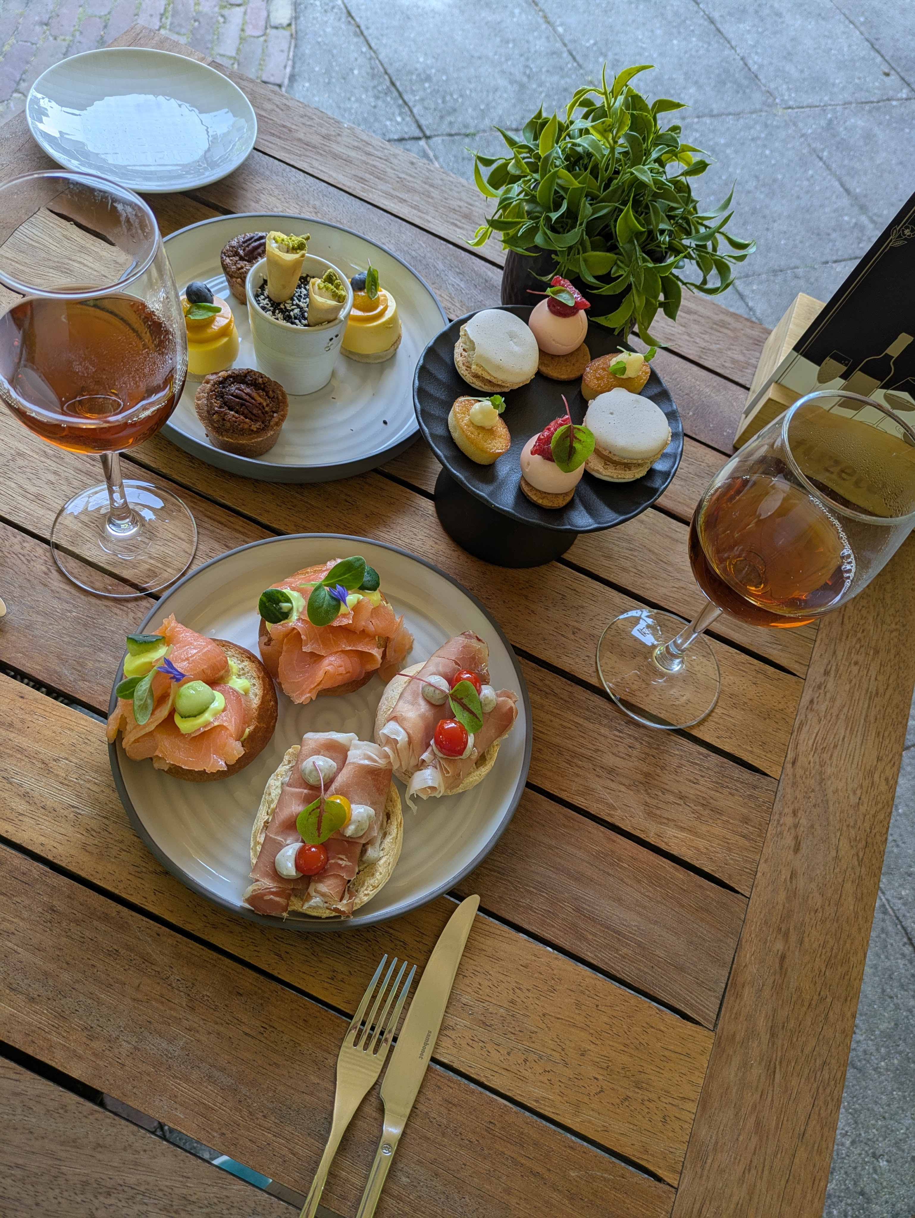 Na deze high tea zijn we een rondje gaan wandelen aangezien ons in de avond ook nog een 7-gangendiner stond te wachten. Zeven heerlijke schilderijtjes met bijpassende (halve) glazen wijn, daarna nog koffie, en vooruit, nog een paar friandises toe. Het zat allemaal in ons ‘culinaire arrangement’. Uiteraard de volgende ochtend nog heerlijk ontbeten om dit bacchanaal weer af te sluiten. Overdreven? Ja, wellicht.